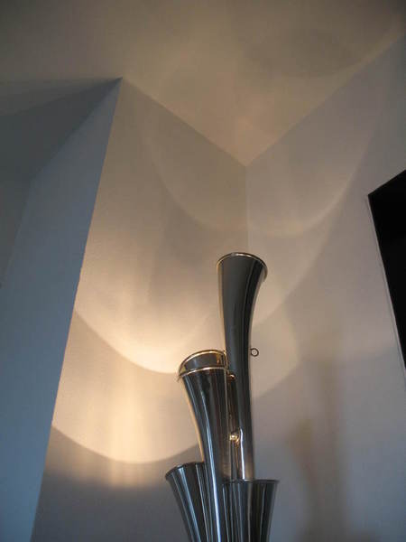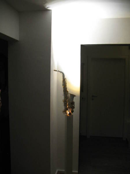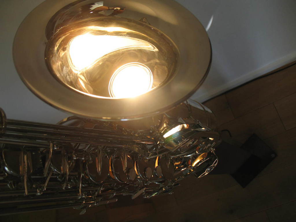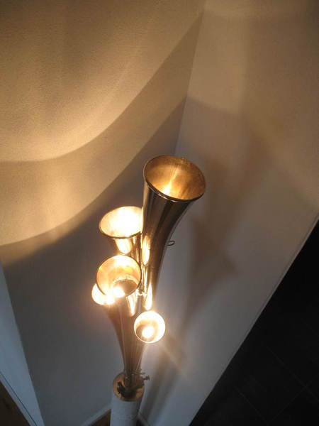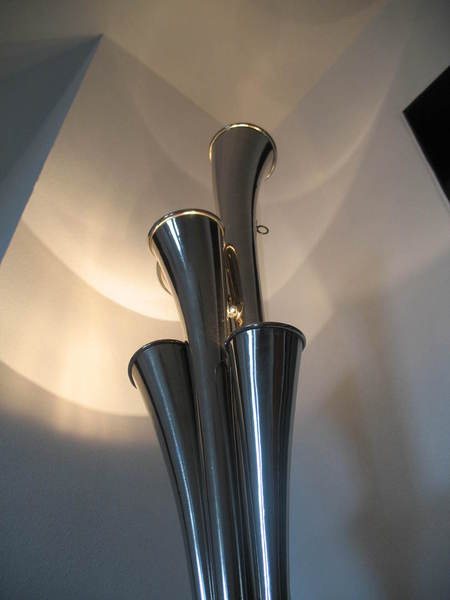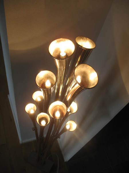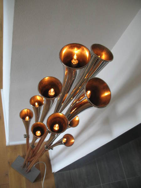 Die etwas andere Stehleuchte von Bernd Dürr. Dieser besondere Stehleuchte ist mit 3 LED`s ausgestattet und Stufenlos dimmbar. Die 8,5 Watt im Trichter verbaute LED kann Ihren Raum indirekt über die Wand und Decke ausleuchten. Die zwei, in den speziell für diesen Entwurf gefertigten Messingschirmchen, verbauten LED`s leuchten das Tenorhorn von unten an und setzen das Instrument in den Mittelpunkt. Gerne können Sie Ihr eigenens Instrument einbringen. Der Preis für diese Einzelstücke liegt bei 3.200€.