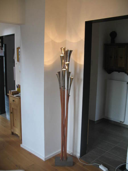Diese Eigenentwürfe aus Schalmeimusikinstrumenten sind wahre Lichtwunder. Die Instrumente sind mit ihren 5- 16 Kelchen tolle Lichtquellen. Sie sind stufenlos - von Kerzenlichtstärke bis sehr hell - dimmbar. Auch die abstrakte Variante mit Kupfersockel sieht tagsüber aus wie eine moderne Skulptur. Die Preise liegen zwischen 1700€- 2900€.