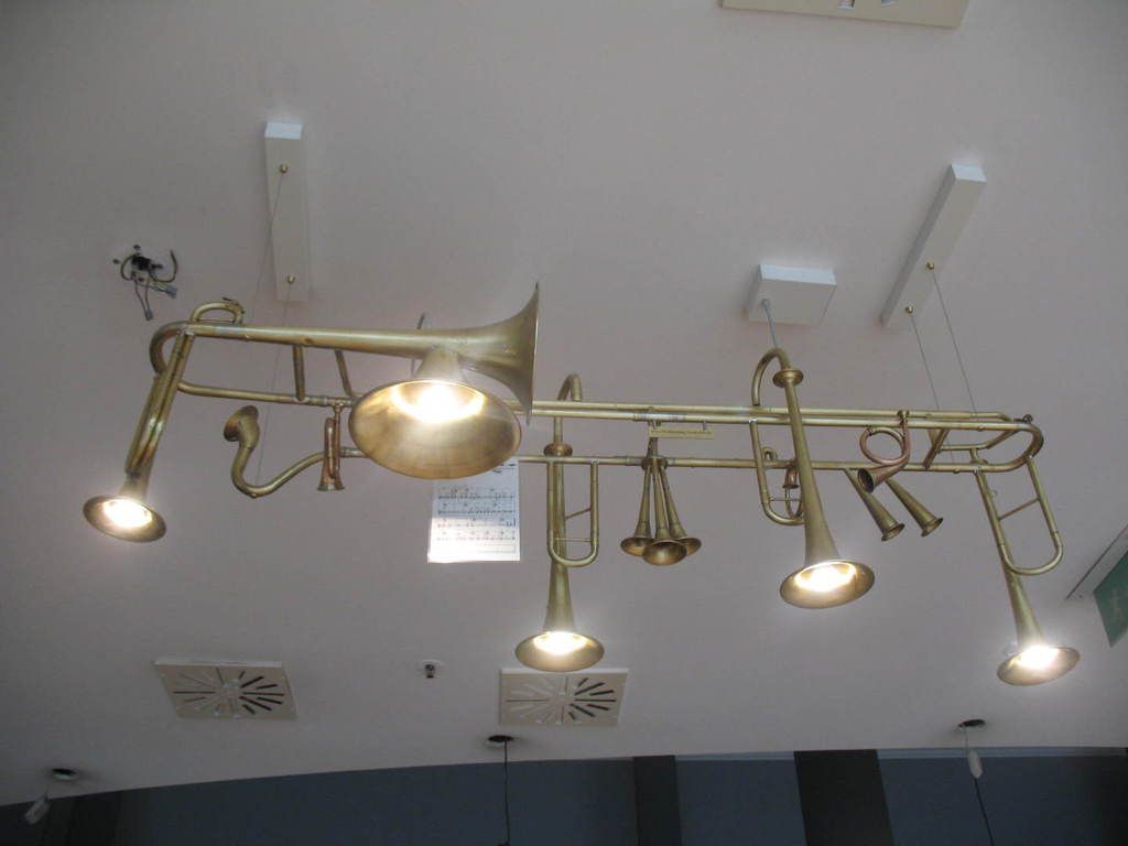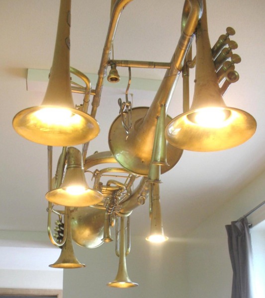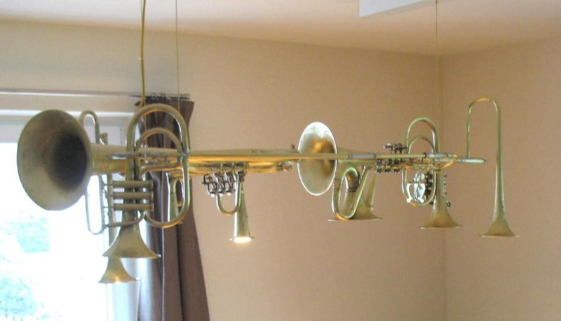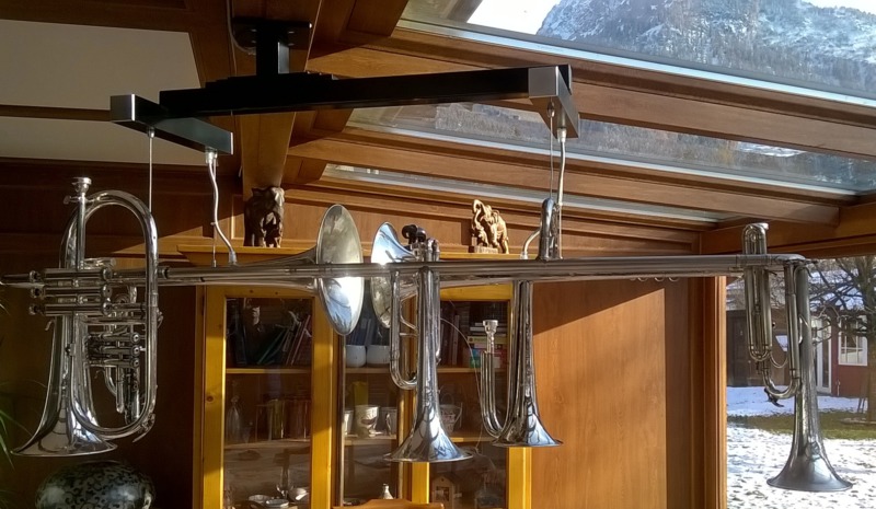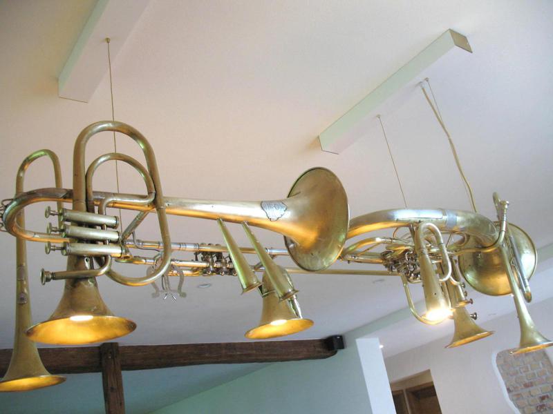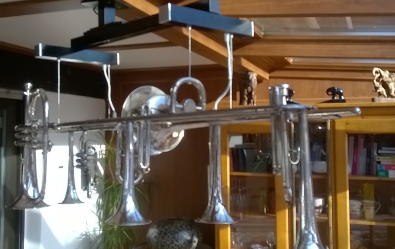 Diese einmaligen Hängeleuchten sind Einzelanfertigungen und entstehen immer auf Kundenwunsch. Sie bestehen aus Posaunen, Hörnern Trompeten und sonstigen Einzelteilen aus dem Musikberreich. Die Leuchten werden am Stück gearbeitet und mit Aufhängung geliefert. Gerne stelle ich Ihnen Ihre Wunschleuchte zusammen und mache Ihnen ein faires Angebot.