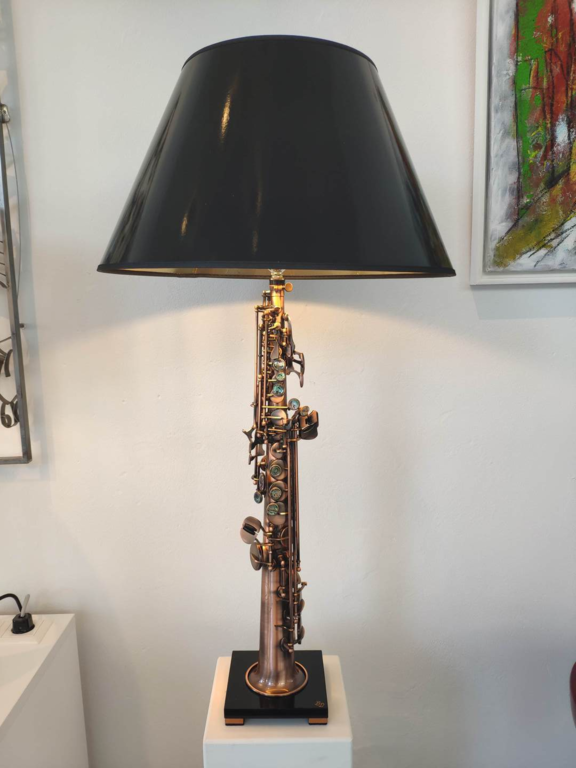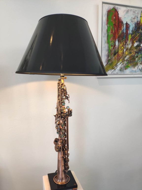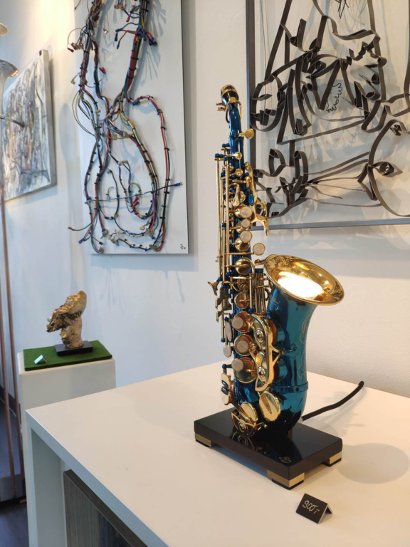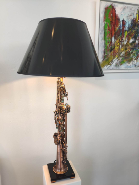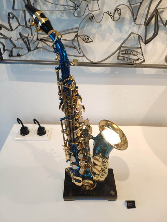 Die Saxophon-Leuchte in einem blau Ton ist die kleine Variante.