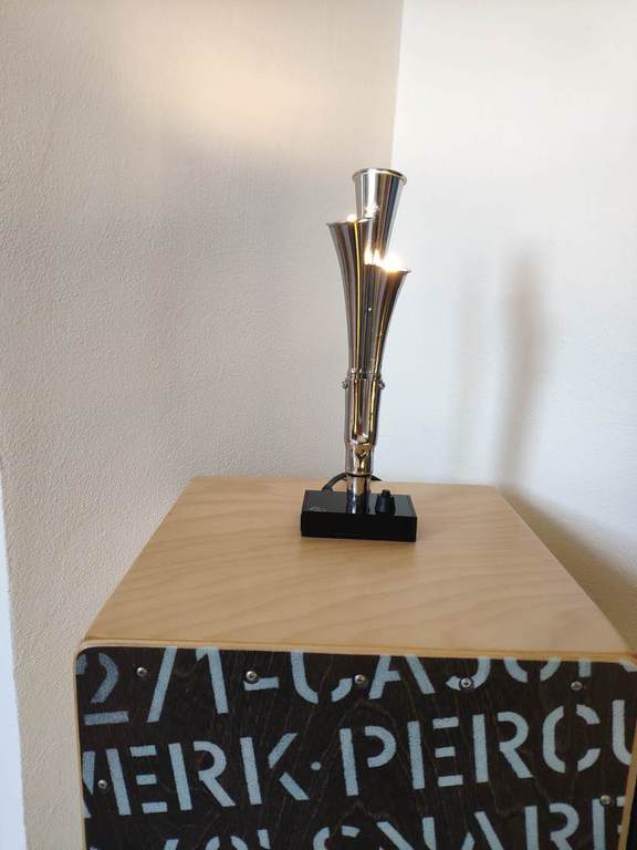 Die Querflötenlampe in gold oder silbervariante eignet sich als kleine Tischlampe auf Beistelltisch, Sideboard oder Fensterbank. Die Höhe liegt bei ca. 55cm und die Breite ca. 30cm.